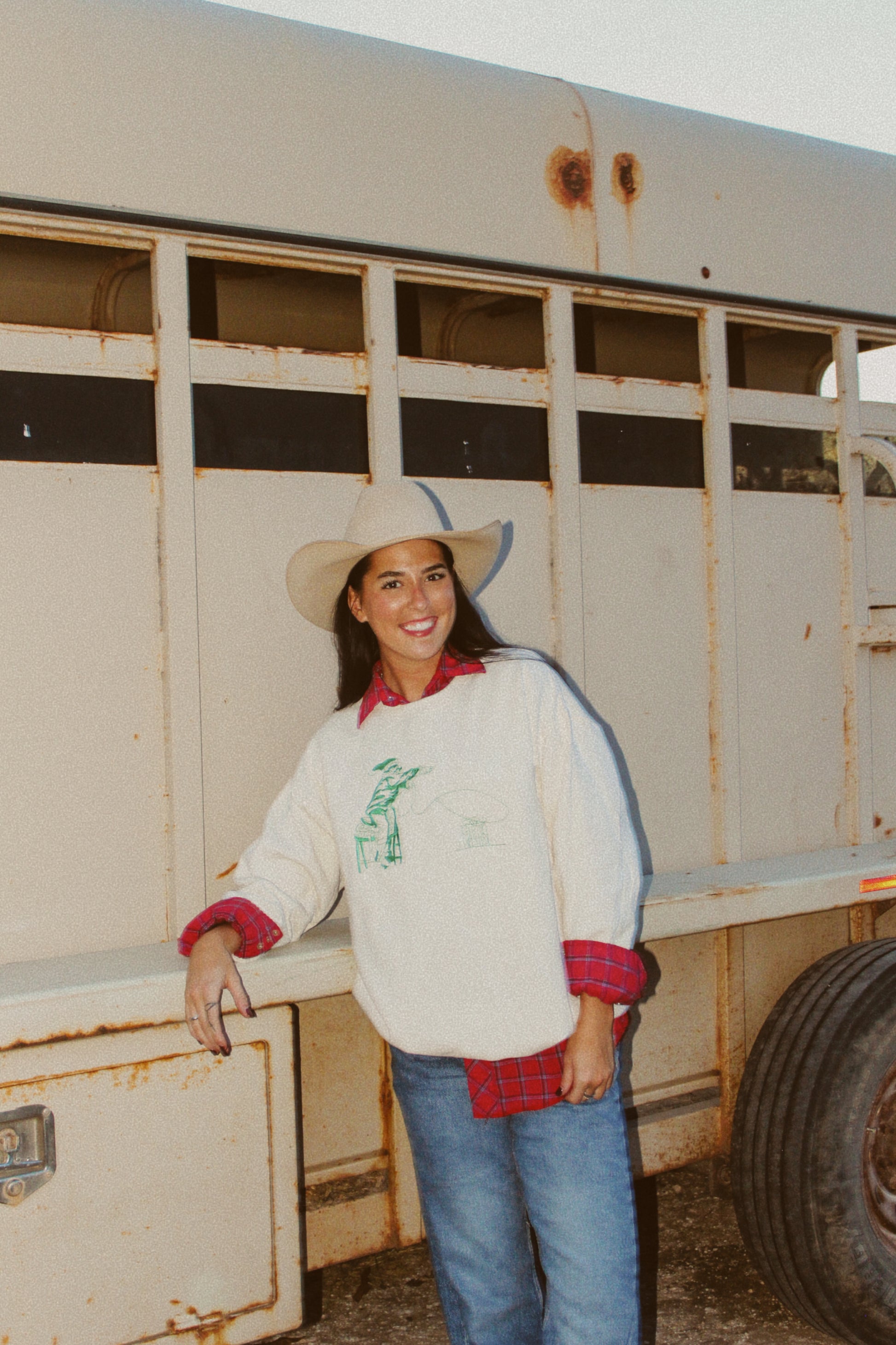 This festive design brings together two icons—Santa Claus and the cowboy spirit—for the ultimate Christmas look. Featuring a cowboy Saint Nick in action, roping a present while rocking his custom tooled saddle (shoutout to his off-season in Wickenburg, if you know, you know). This sweatshirt tells the story of a man who’s as skilled with reins as he is with reindeer.